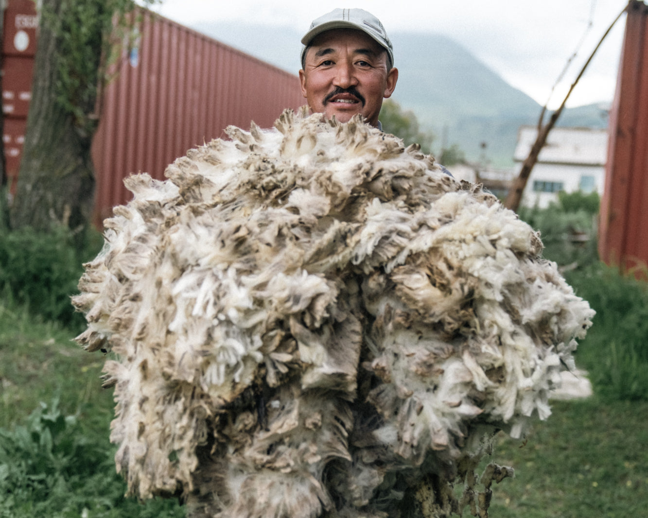 The Kyrgies process begins at the source with raw wool that is collected from family-run farms across Kyrgyzstans's vast and mountainous country. Kyrgyz wool is ideally suited for felting due to the especially long fibers found on its sheep.